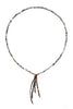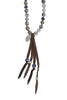 Chan Luu layering necklace features a cotton cord strand embellished pyrite, gray cloudy quartz, and sodalite semi-precious stones. The strand is accented with antiqued silver Indian beads and features chocolate leather fringe details at the base.