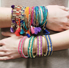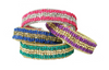 Handmade in India with colorful seed beads and double center stripe of gold plated beads. This is a 1/2" wide cuff that molds to fit most wrists.