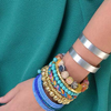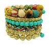 A spiral of mixed media bracelet with Kantha fabric beads, colored glass beads, metallic beads, vibrant braided threads, and gold filigree beads forming 6 rows around your wrist. The Kantha fabric is made out of recycled cotton sari straps. Each piece will vary in pattern and color making it unique.
