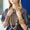 Colorful wood beads covered with recycled Kantha fabric dotted by tiny brass beads. A clasp closure lets you wear it long, layered, or as a chunky bracelet.