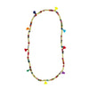 A necklace that stretches enough to make a bracelet with a mixture of matte gold and colorful Kantha textile beads, interlaced with multicolored tassels.