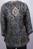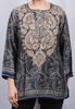 Buy online Dolma's classic tunic featuring beautiful natural hand-embroidery on a navy patterned silk and polyester blend top.
