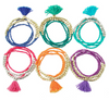 Each strand features colorful opaque seed beads interrupted by two sections of metallic beads and finished with a tassel in matching colored thread. These stretchy strands can be worn long as a necklace or looped around the wrist several times for a bracelet.