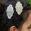 A highly embellished, vintage-inspired hair clip that combines elements of traditional deco style - lavish ornamentation and bold geometric shapes. The Deco Hair Clip is hand beaded with metallic glass seed beads and diamante beads. Reverse side is backed with black velvet. Available in gold and silver.