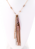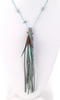 Single strand chain necklace with a cluster of beaded and leather strands and a feather pendant.