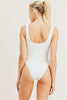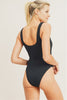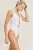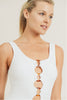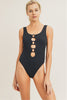 Mono B special ribbed stretch fabric in a one-piece swimsuit featuring three black acrylic O-ring accents on the front for a flirty, peekaboo vibe.