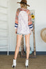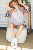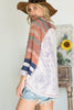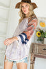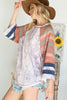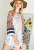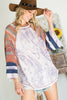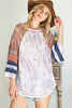 The Buckeltist Paisley top features a contrasting print of dark stripes and lavender paisleys of raglan sleeves.