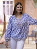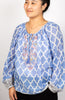 The Dolma Isadora Blouse is a cute top featuring an embroidered and beaded neckline with a tie at the top. Block-printed cotton is comfortable and lightweight. See also the gathered sleeves with a contrasting print.