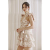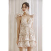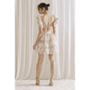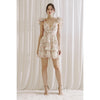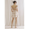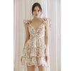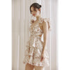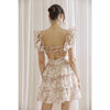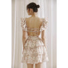 Storia's romantic mini dress features a sassy rose and leaves print, open back with a tantalizing crisscross tie, ruffled hem, and a stealthy invisible zipper. Show off that plunging neckline, fluttery ruffled straps, and empire waist for your next big wedding shindig!