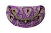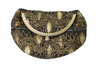 This vintage-style bag is handcrafted from an embellished sari textile. It has a spacious interior formed with pleated sari fabric, it has a brass frame folded over with a pop clasp closure, and a unique crescent shape. It’s perfect for an evening out.