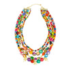 The Spiked Kantha Necklace features four colorful strands of repurposed Kantha textile beads embellished with three sets of diamond-shaped metallic spikes and gold-toned brass beads.