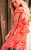 The Rice Dress has a retro look with ruffles and plunging back will definitely be summer 2018's must-have. We love the vintage style mixed with coral print embellished with gold touches and flowing volume.