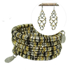 A bracelet of six rows of gold, silver, and gunmetal rings spiral up the arm, giving the illusion of one stalk of bracelets. Both ends with teardrop shaped metal charm. Along with matching metal drop earrings.