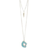 Simple Southwest style featuring a delicate layer necklace including a silver feather drop and silver-bordered faux turquoise slice pendant.