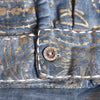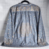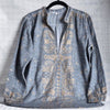 Women's denim henley shirt with a handmade metallic gold foil Henna design all the way around.
